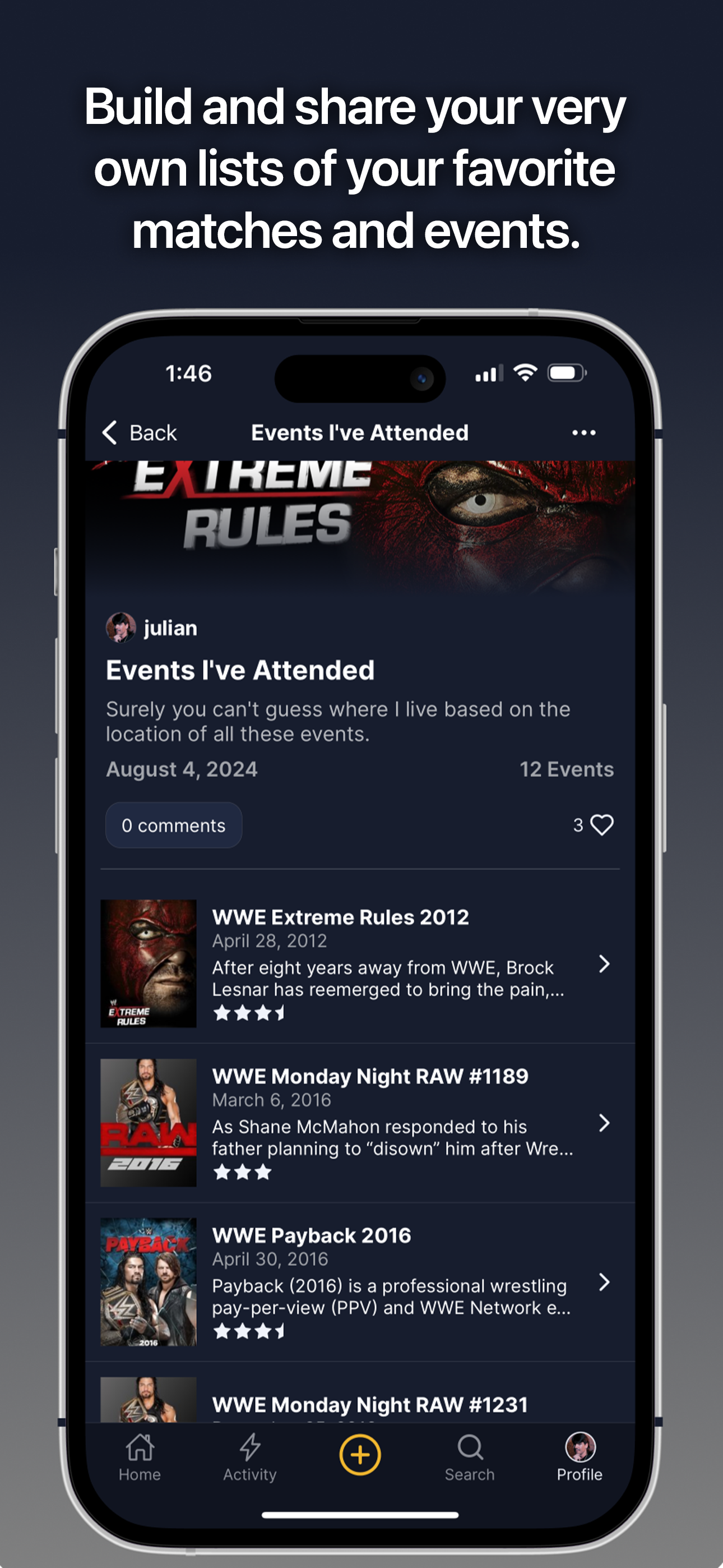 Rate and review wrestling events and matches.