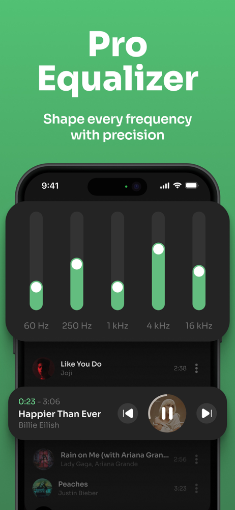 Amplifies volume, boosts bass, customizes equalizer.
