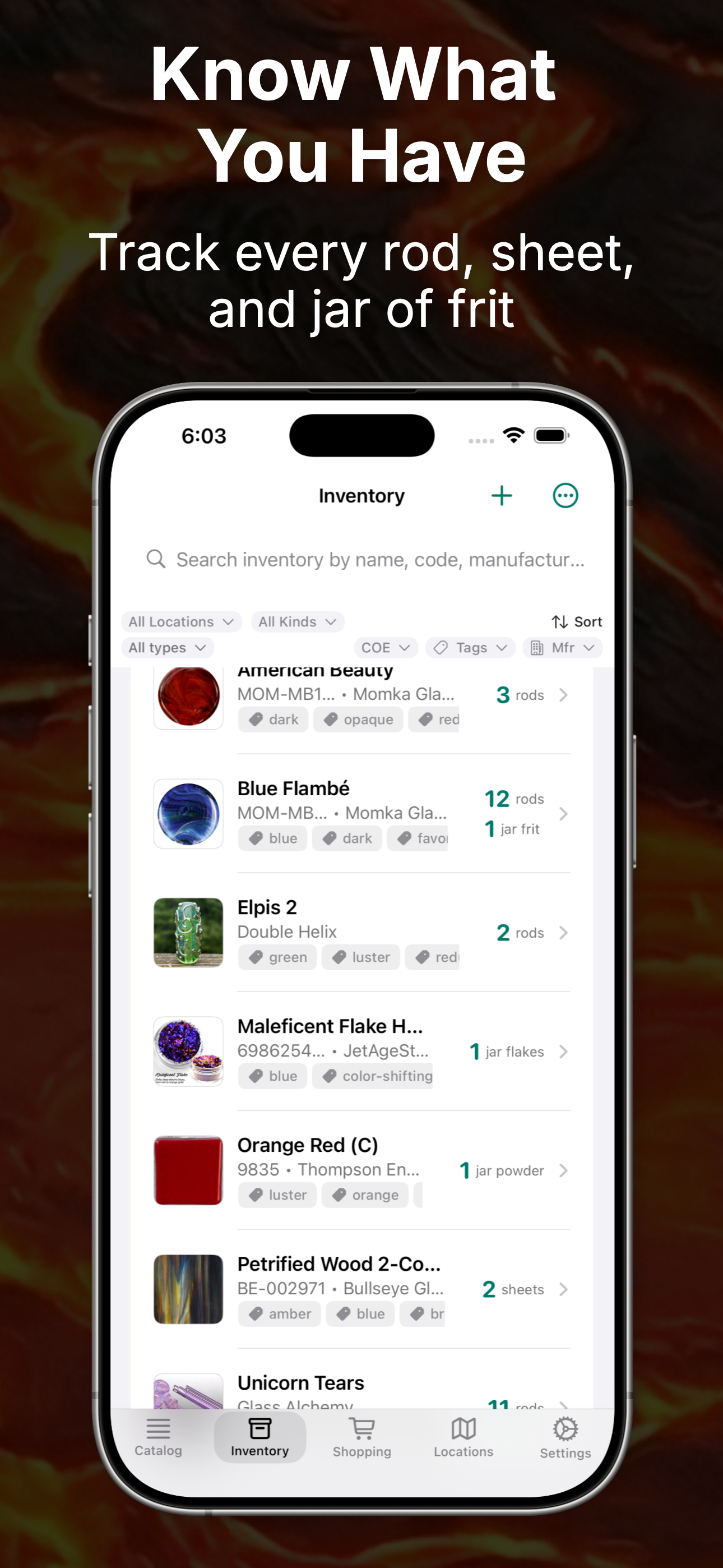Inventory management app for glass artists.