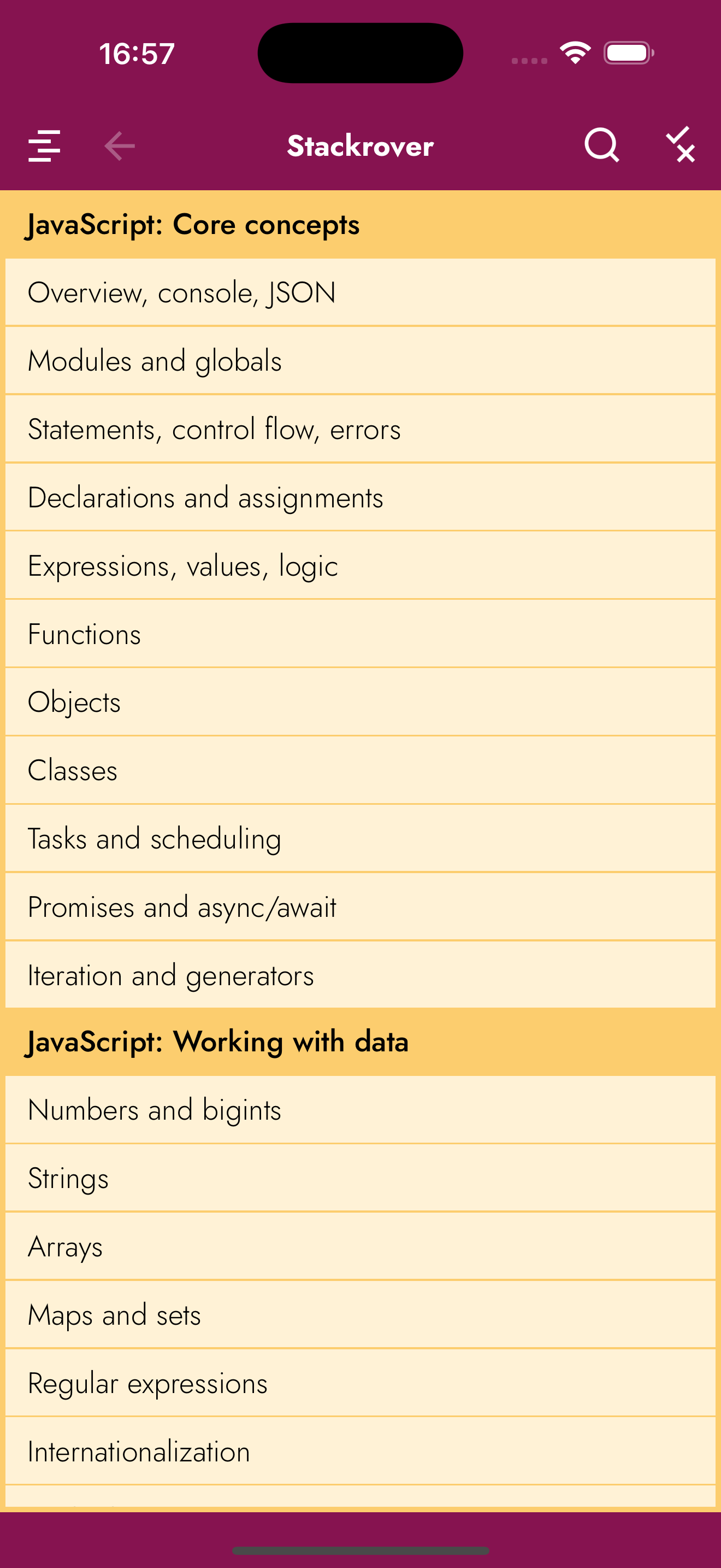 Interactive JavaScript manual with quizzes.