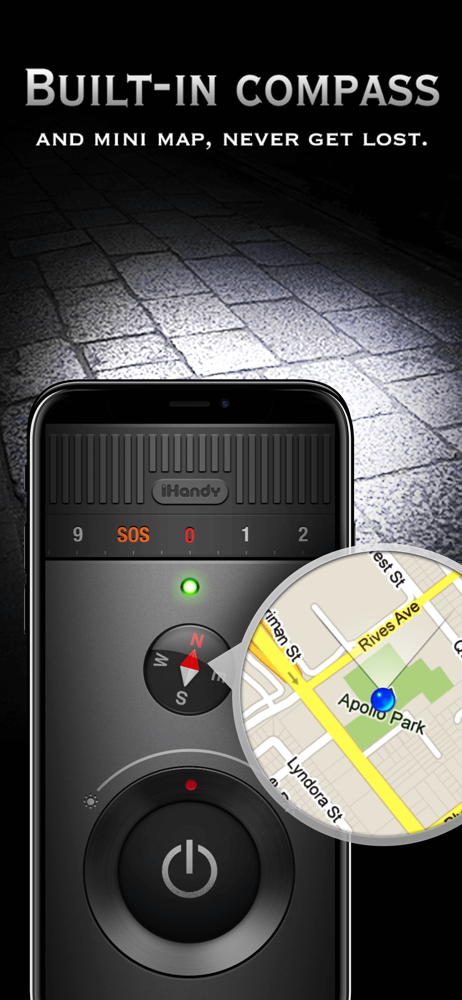 Bright flashlight with compass and mini map.