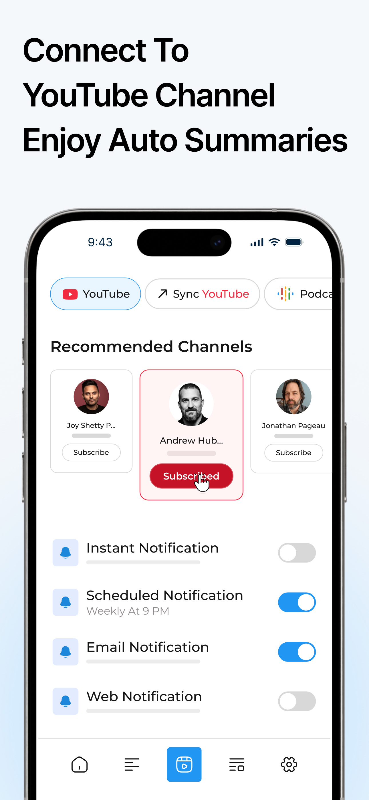 Summarizes YouTube videos, podcasts, and articles.